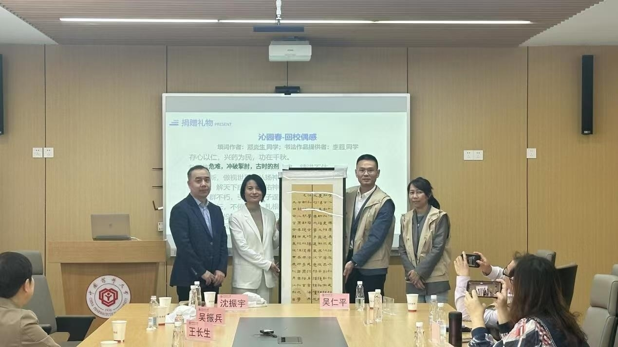 接下来,1994级医药企业管理专业的校友代表向幸运轮盘 捐赠了诗词书法作品,表达了全体校友对母校和幸运轮盘 深深的敬意和衷心的祝福。校友们表示将继续践行“精业济群”的校训精神,为医药事业、为社会发展增光添彩。