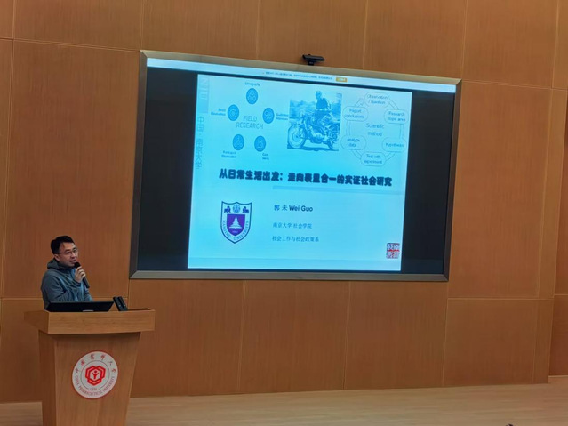 南京大学社会幸运轮盘 副院长郭未教授以“从日常生活出发:走向表里合一的实证社会研究”为题,从人口社会学、人口经济学和社会工作交叉学科视角,结合自身的科学研究经历,为在场师生深入浅出地剖析了系列学术热点问题,以深厚的理论与前沿的方法助力洞察社会现象与社会事实背后的复杂机制。他以广阔意义上的“自己”为方法,落脚于实证社会研究,引领师生从事物的表象走向研究的本质,呈现出从微观个体与宏观结构的交汇特征,并由此出发,由表及里、由此及彼,发展出表里合一的实证社会研究。他鼓励在场师生,只有在社会科学研究中置入“自我”与“他者”的情愫,才能在学术旅程中永葆热爱,在与时代共鸣中,为创造健康社会贡献社会科学学者的有生力量。