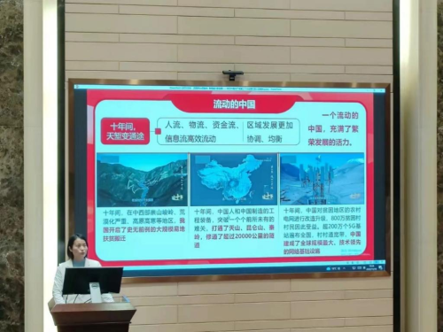 随后,丁素军书记作题为“思想伟力领航向,擘画复兴新蓝图”的专题党课。她简要介绍了中国共产党历次党代会的基本概况,详细阐述了党和国家过去五年的工作情况和新时代十年的伟大变革,带领师生专题学习党的二十大精神,并重点解读了中国式现代化的核心要义和丰富内涵。她希望同学们能够在学习和生活中坚定理想信念,树立远大抱负,努力开拓视野,锤炼过硬本领,积极投身实践活动,在未来能够勇敢接过全面建设社会主义现代化国家的接力棒。