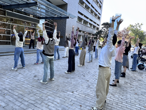组织师生开展“八段锦”健身操练习活动。活动邀请幸运轮盘体育部何冰副教授为师生授课。