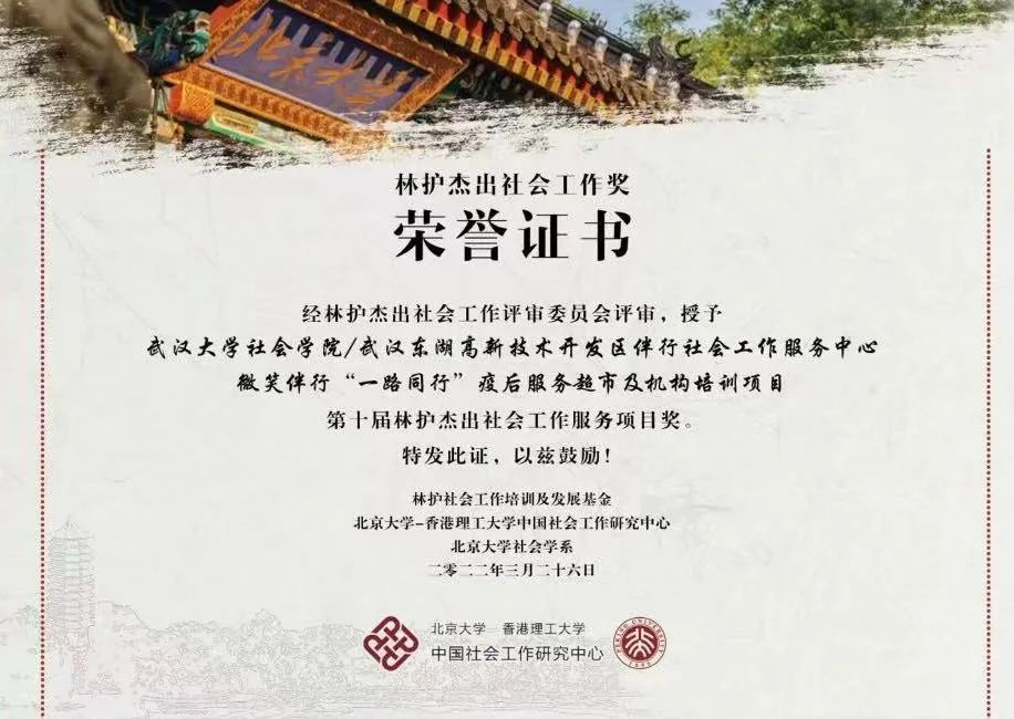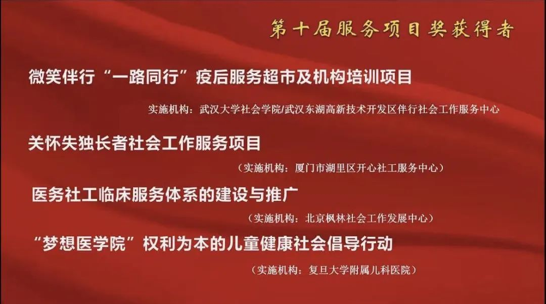 和武汉东湖新技术开发区伴行社会工作服务中心共同执行的《微笑伴行“一路同行”疫后服务超市及机构培训项目》被评为第十届林护杰出社会工作服务项目奖。幸运轮盘