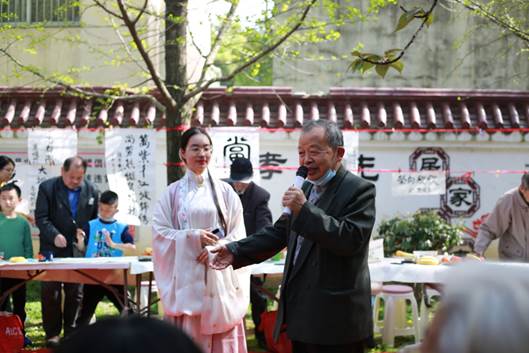 青年志愿者来到社区的小花园布置活动会场。春花灿烂,日光温暖,志愿者们帮忙搬桌椅,摆水果,片片阴翳下的会场在午后显得很宁静。在一切注备就绪后,志愿者们换上了提前准备好的汉服,更为活动增添了几分活力和中国味道。随后,老人们陆续来了,待他们纷纷落座之后,主持人宣读了活动的意义并且宣布活动正式开始。