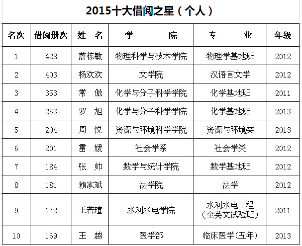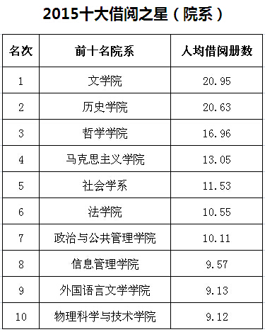 2013年度我系也入围借阅图书量最高的前十名本科生及人均借阅册数最高的前十名院系。(王红报道)