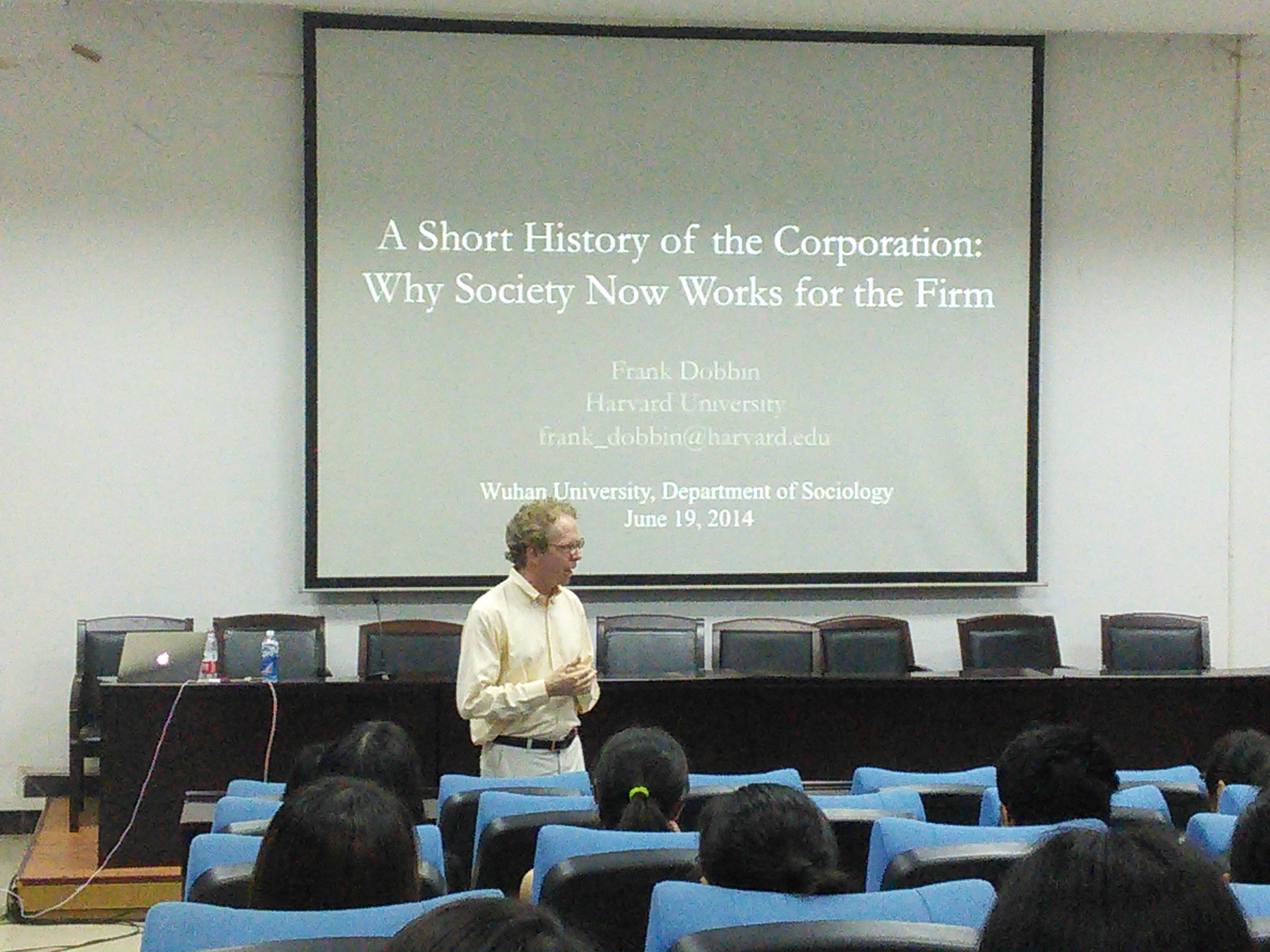 社会学系邀请,美国哈佛大学社会学系Frank Dobbin教授在我系学术报告厅为师生带来了一场题为《A Short History of the Corporation: Why Society Now Works for the Firm(公司简史:为什么现在社会为公司工作?)》的讲座。讲座由陈昫博士主持,我系部分本科生、硕士生、博士生及教师聆听了该场讲座,并与Frank Dobbin教授进行了互动交流。