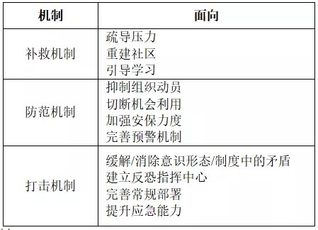 该框架有两个方面的现实意义:第一,强调“补救机制”在防范伊斯兰极端主义过程中的重要作用。本文提出从“压力疏导”“社区重建”“学习引导”三个方面来建构相应的补救机制,并将“恢复社区的支持和约束功能”作为衔接三者的关键节点,较为清晰地展现了为何补救和如何补救这两个关键问题。第二,强调“缓解乃至消除意识形态及制度中的矛盾”对防范伊斯兰极端主义的重要性。例如精神和制度层面的“压力”就与穆斯林和主流意识形态之间的分歧有关,“组织动员”和“机会利用”更是直接得益于意识形态及制度中的矛盾所提供的政治机会。从这个意义上讲,如何处理这一问题也就具有了战略性意义。