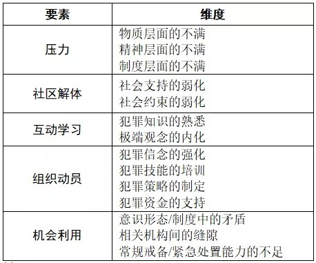 基于犯罪社会学的视角,本文构建了一个能够体现各要素之间动态转化关系的整合性分析框架。本文认为,极端主义的演变需要经历“个体极端化”“组织动员”和“机会利用”三个阶段,而它们之间的递进转化又取决于是否会出现压力、社区解体、互动学习、组织动员、机会利用五个理论要点。