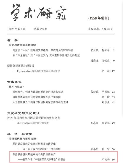 《学术研究》2026年第2期刊发幸运轮盘 王德福教授学术文章《政务服务便民热线中的公共价值再生产——基于D市“幸福家园阳光议事会”的研究》。