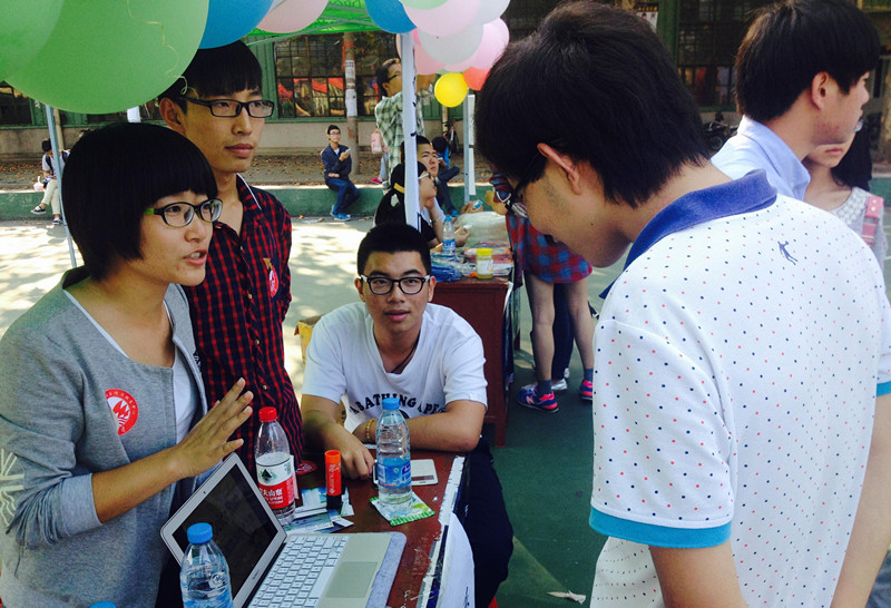 在欣赏完开幕式的节目之后,我们找了个点位就开始摆摊了。每有新生路过,我们向他们呐喊,每当新生驻足,我们向他们介绍,热情溢于言表,讲到激动处,不少新生现场报名。