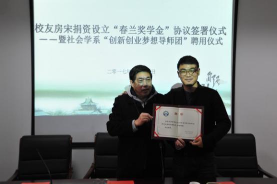 房宋校友曾就职于腾讯公司,目前在某金融科技企业担任总监。在房宋校友的捐资支持下,我系从今年起将设立“春兰奖学金”以奖励在创新创业方面表现突出的本科生和研究生,该奖学金项目每年将授给2位学生各五千元奖金,我系与房宋校友的首期协议年限为4年。同时,我系聘任了房宋校友作为社会学系创新创业梦想导师,日后,他将为在校生的学业、职业规划提供更多帮助和支持。